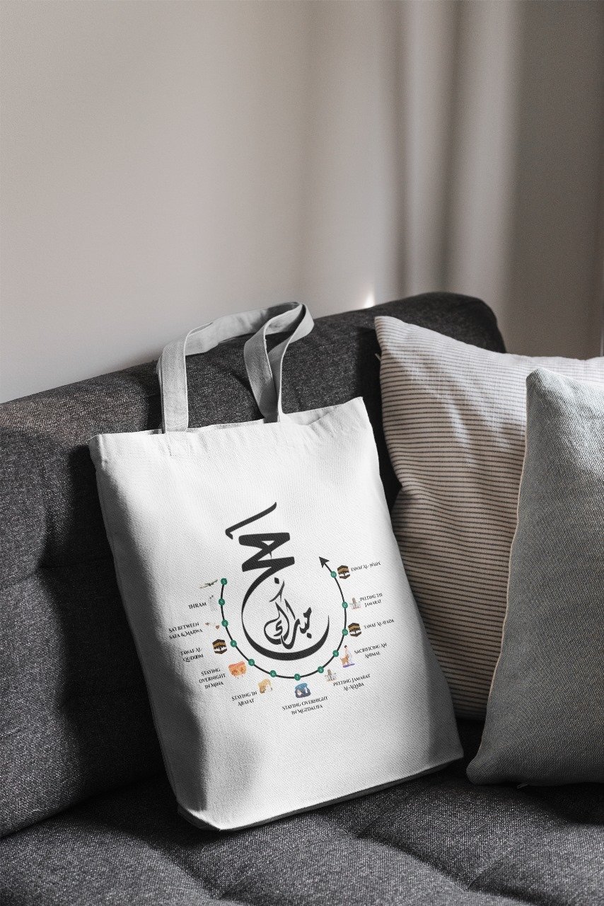 Made from high-quality, eco-friendly fabric, each bag features elegant calligraphy along with subtle Islamic motifs that add a spiritual touch. Whether used for daily errands, travel, or as a special gift for someone returning from Hajj, these tote bags combine practicality with heartfelt meaning.