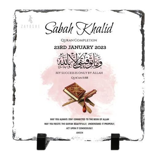 Celebrate the momentous achievement of Quran completion with a Personalized Quran Completion Rock Slate For Her. This unique and elegant keepsake is a perfect way to commemorate this special occasion and cherish it for years to come.