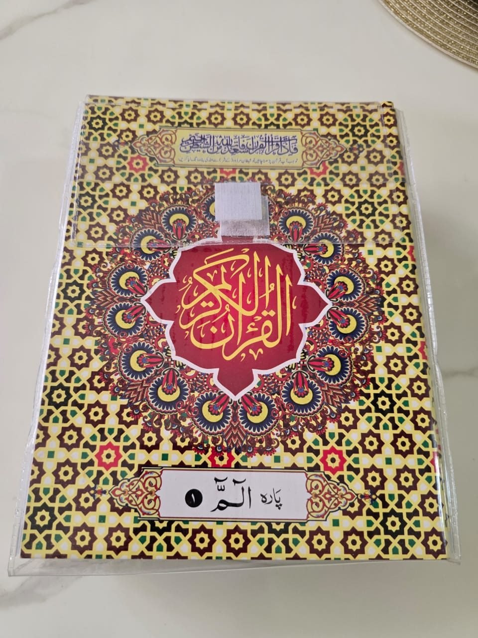 The Al Gaba Holy Quran Set is a high-quality, elegantly designed Quran set, divided into multiple volumes for easy recitation and study. This particular set includes Para 9, Para 5, and Para 3, making it a convenient choice for those who prefer reading the Quran in smaller sections rather than a single bound volume.