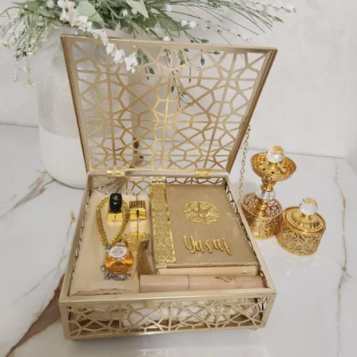 The personalized royal islamic gift box for him is a unique and meaningful way to celebrate faith, devotion, and special moments. Thoughtfully designed, this luxury set brings together timeless essentials that hold both spiritual and sentimental value. At its core is a beautifully personalized Quran, paired with an engraved wooden miswak, symbolizing purity and tradition. To complement the set, it includes a premium Hamidi White Oud fragrance, a finely crafted prayer mat with pouch, tasbeeh, bookmark, and other worship accessories. Presented in an elegant keepsake box, this gift creates a lasting impression that blends spirituality with sophistication.