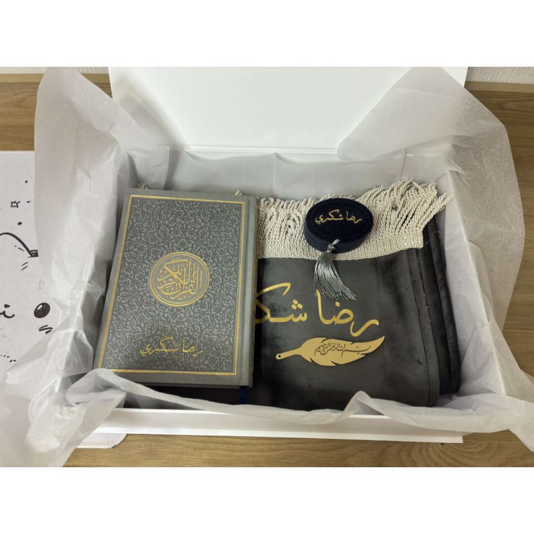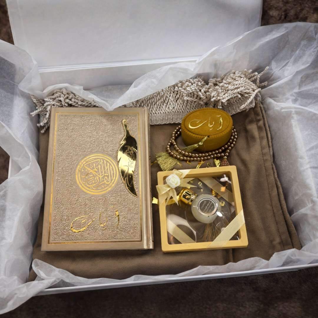 Featuring a plush khushu velvet prayer mat with gold Arabic calligraphy, a personalized Quran, and carefully selected accessories, this gift set blends beauty, devotion, and sophistication in one memorable package.