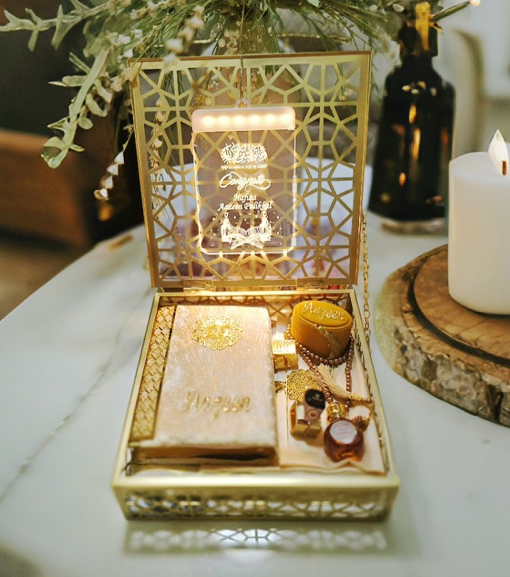 Encased in a stunning personalized gift box with intricate gold detailing, this exquisite set includes a beautifully customized Quran, a plush velvet prayer mat, and a radiant crescent-shaped LED light inscribed .This elegant ensemble blends tradition, luxury, and spirituality—making it a truly memorable and heartfelt gift for a Hafiza.