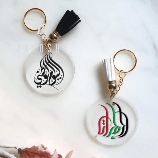 Set Includes: 2 keychains – 1 with UAE flag and calligraphy, 1 with customizable name