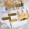 The topper features a detailed mosque silhouette, complemented by directional signposts pointing to “Jeddah,” “Makkah,” and “Medina.” These iconic destinations add a meaningful touch to your celebration, reflecting the sacred journey of Umrah.