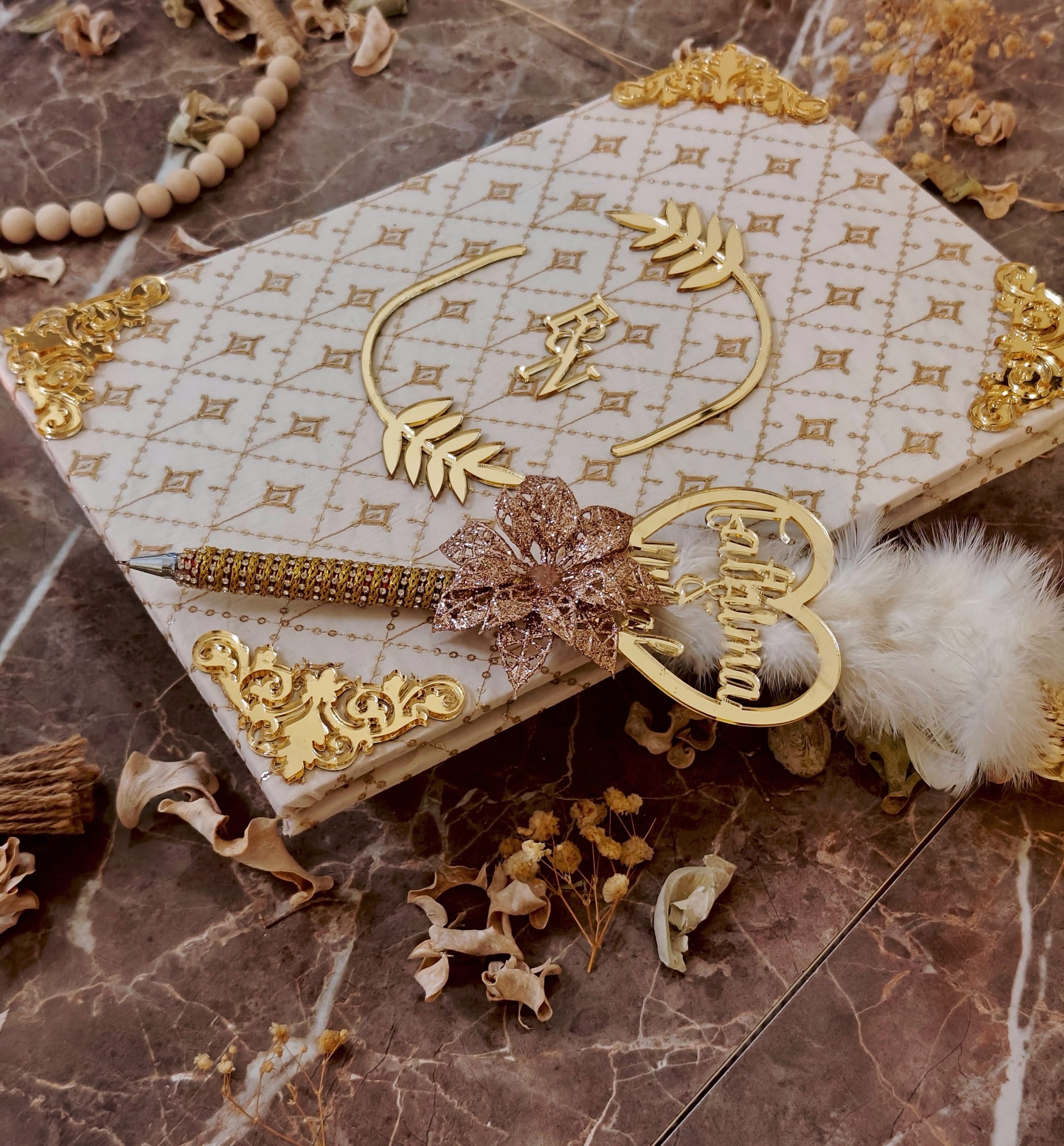 Elegant Nikkah Certificate with Customized Nikkah Pen-White is a luxe, personalized keepsake crafted to honour and preserve your Nikkah contract. A regal white certificate with gold-embossed floral detailing and monogrammed initials pairs with a matching customized Nikkah pen presented in a protective box. Printed on durable, archival-grade paper and offered as a complete set (or as certificate/pen separately), it’s perfect for signing, display, and archiving treasured wedding moments. Designed as a premium gift for couples, this set brings ceremony and lasting elegance to any Dubai wedding. Buy Elegant Nikkah Certificate with Customized Nikkah Pen-White — personalized, ready-to-gift, and made for Dubai couples