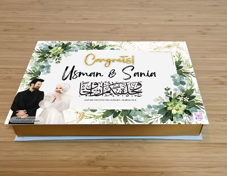 Elevate your wedding with the Luxury Wedding Chocolate Box, a sleek keepsake filled with artisanal wafer chocolates crafted by Le Chocola. Designed for elegance, each box can be personalized with names and dates and paired with a choice of acrylic designs, making it a tasteful favour for guests or a special gift for the bridal party. Available in 15 or 30 bar options, the box combines beautiful presentation with rich, delicate flavours that suit refined celebrations in Dubai. Thoughtfully packaged by Zayoshe, it blends luxury, personalization and memorable tasting to make your wedding uniquely sweet, creating lasting moments for guests.