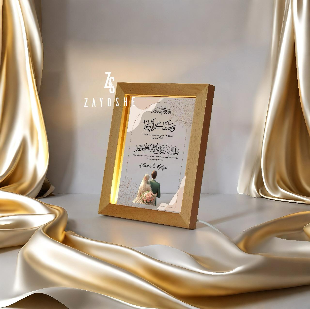Celebrate love and faith with the Couple Islamic Customized Wedding Frame Lamp, a warm LED keepsake that blends elegant calligraphy and personalised details for newlyweds. Handcrafted with a wooden frame and high-quality acrylic panel, the lamp gently illuminates a custom couple name, wedding date, or Quranic blessing to create a timeless bedside or mantelpiece accent. Ideal for nikah, walima, or anniversary gifts, it ships in premium gift-ready packaging and comes with easy USB power and remote brightness settings. Thoughtful, durable, and uniquely Islamic, this lamp transforms memories into a soft glow that blesses a home for years to come forever.