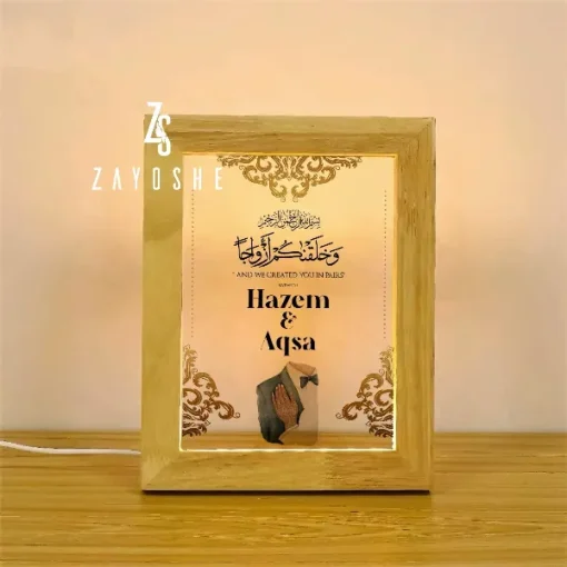 The Islamic wedding frame lamp blends elegant Arabic calligraphy, warm LED light and a handcrafted wooden frame to create a personalised keepsake for newlyweds. Engraved with the Quranic verse “And We Created You in Pairs” and customisable with the couple’s names, it makes a meaningful wedding or anniversary gift. Soft ambient illumination highlights the intricate bride-and-groom illustration and adds tranquillity to bedrooms and living rooms. Compact yet durable, the lamp arrives ready to display and brings a daily reminder of love, faith and blessings to a shared home.